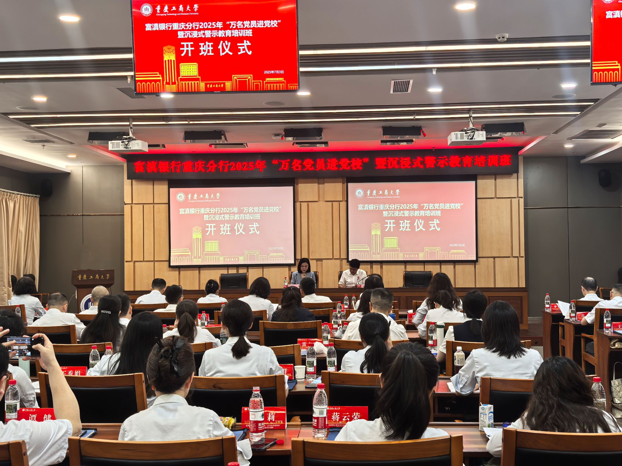 2025/07/082025年7月3日,富滇银行重庆分行2025年“万名党员进党校”培训班在重庆工商大学图书馆一会议室顺利开班。本次培训为期3天,是学习贯彻习近平新时代中国特色社会主义思想,紧密结合中央八项规定及其实施细则精神,持续推进作风建设常态化、长效化的一次主题教育。重庆工商大学继续教育学院院长王燕出席开班仪式并致辞,富滇银行重庆分行纪委书记陈洪波作开班动员讲话。王燕院长代表重庆工商大学对培训开班表示祝贺,对学员作了学习要求和纪律要求,强调了学习意义和学习目标。她围绕“严守纪律规矩、坚持学用...