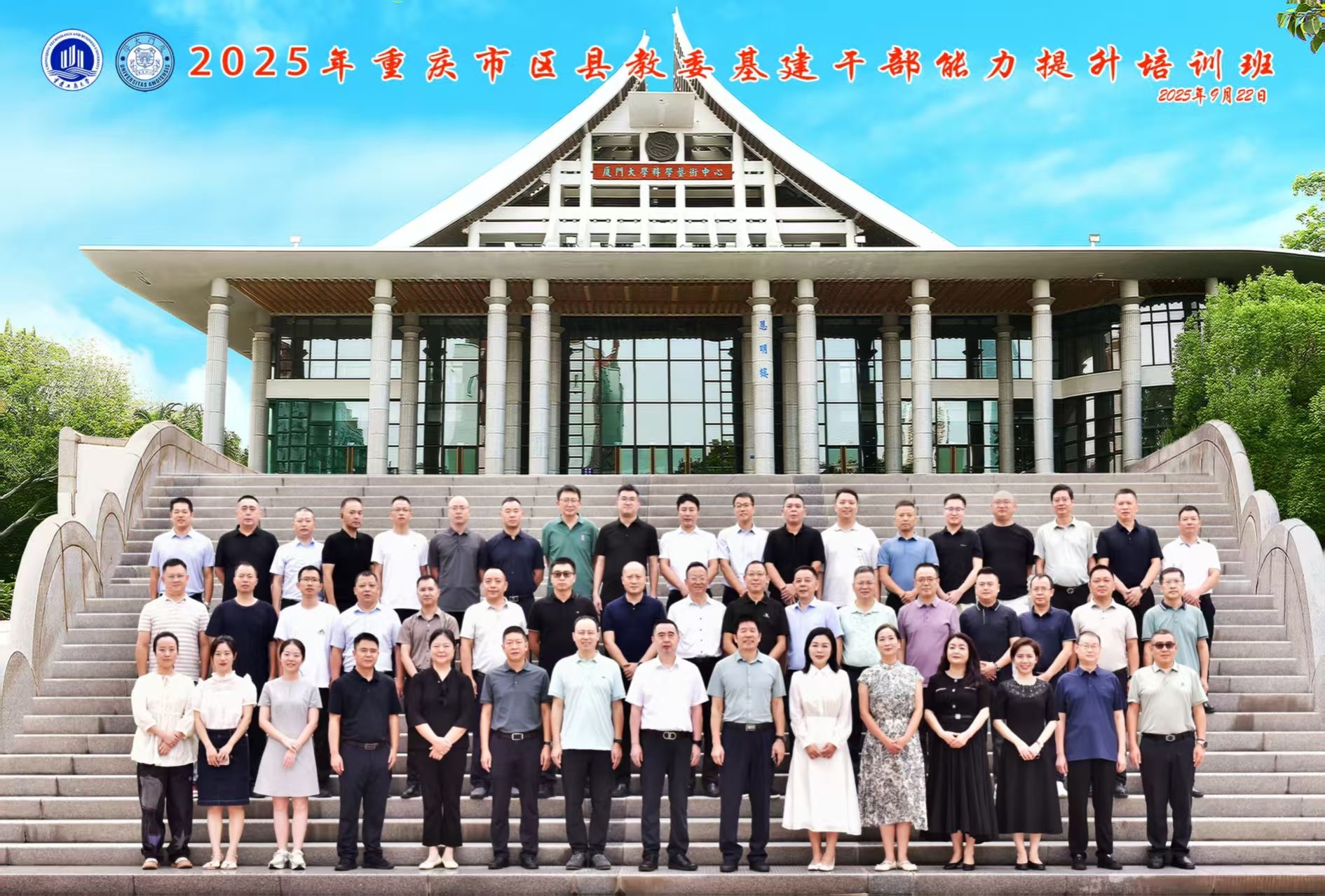 2025/09/289月22日-26日,我校举办的2025年重庆市区县教委培训班顺利完成。本次培训班由重庆市委教育工委、重庆市教委主办,重庆工商大学承办、厦门大学协办。来自全市41个区县教委基建干部共计50名学员参加培训。重庆市教育委员会基建后勤处处长梁杰、重庆工商大学继续教育学院院长王燕、中国教育发展战略学会产教融合专业委员会副理事长、厦门大学原继续教育学院院长许和山出席开班式并讲话。本次培训以专题课程、案例分析、现场教学、学员讲坛等多种方式开展。培训班邀请了厦门大学原继续教育学院院长许和山、厦...